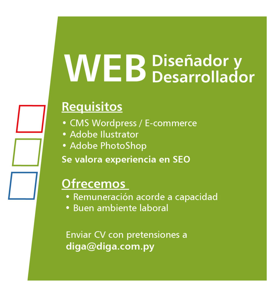 Si estás interesado/a, postulate enviando tu CV con tu pretensión salarial, bajo el asunto “Ref. Diseñador Web” al siguiente mail: diga@diga.com.py