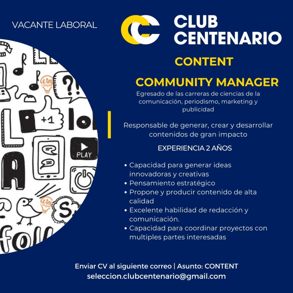 Enviar CV al correo: seleccion.clubcentenario@gmail.com
