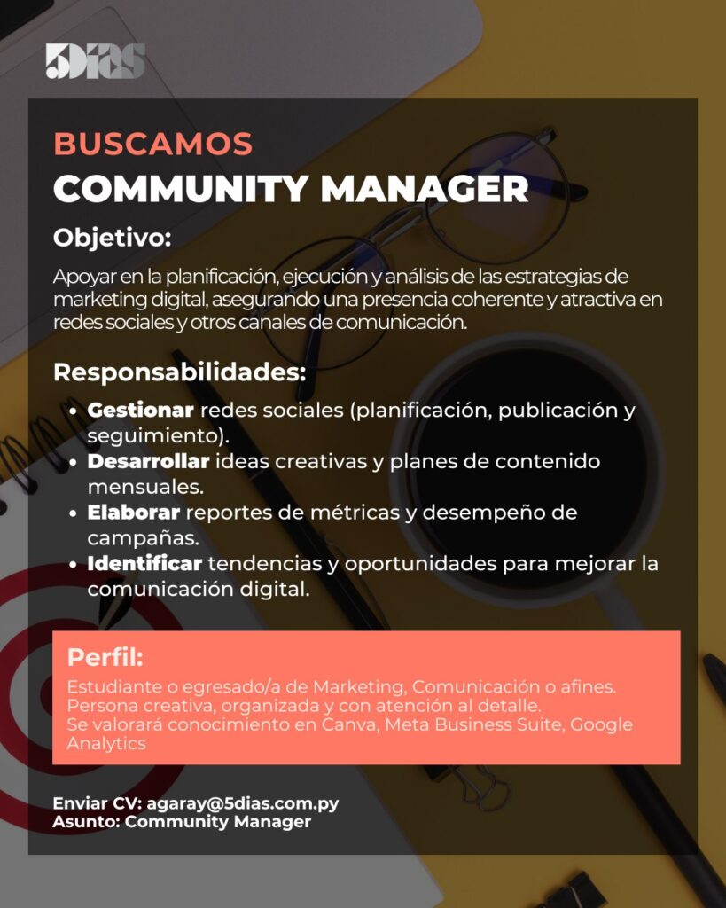 5Días se encuentra en la búsqueda de un/a Community Manager, con perfil creativo, organizado y orientado al análisis de resultados para potenciar la presencia digital de la marca.