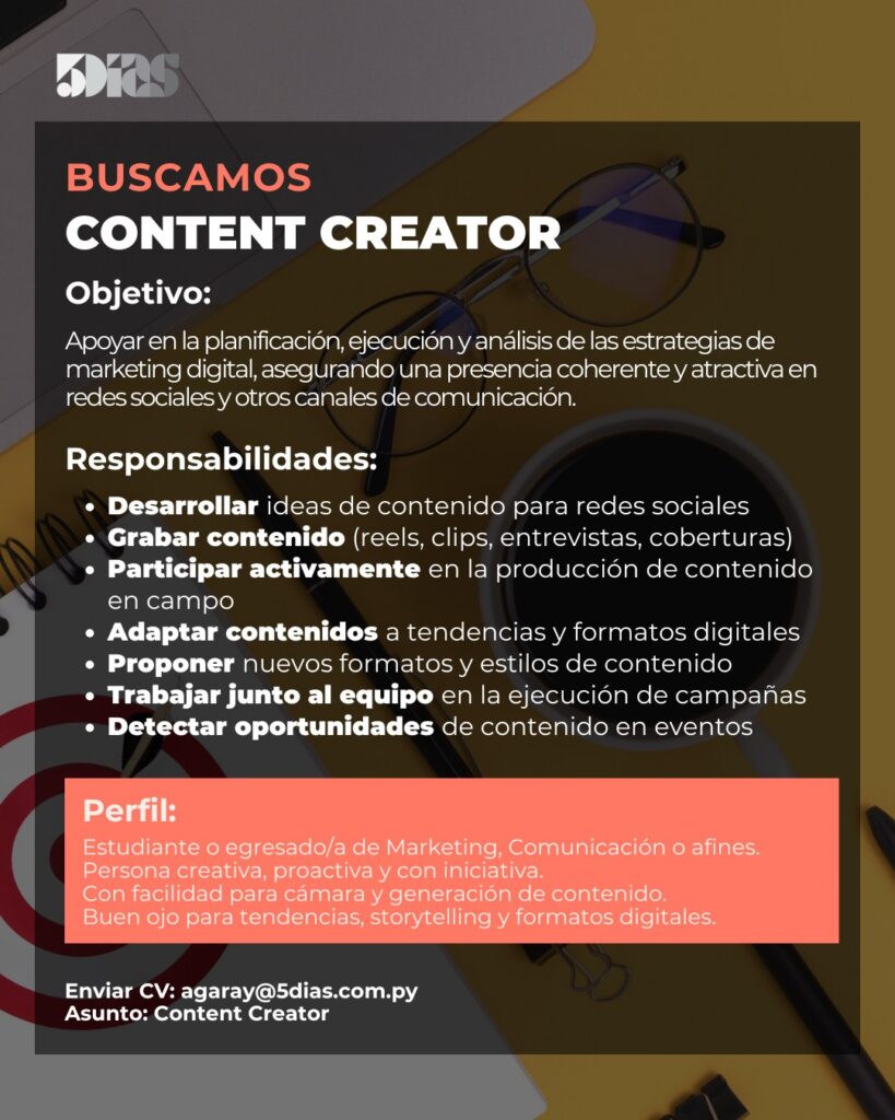 5Días se encuentra en la búsqueda de un/a Content Creator, con perfil creativo, proactivo y con facilidad frente a cámara, para sumarse al equipo y potenciar la presencia digital de la marca.