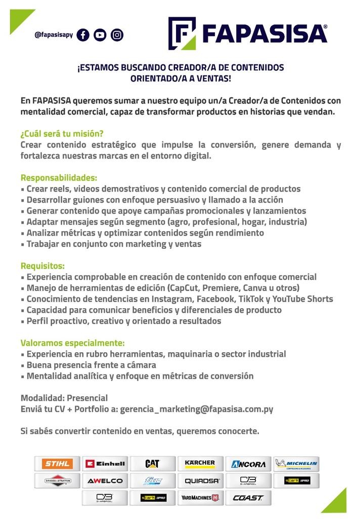 FAPASISA se encuentra en la búsqueda de un/a Creador/a de Contenidos orientado a Ventas, con mentalidad comercial y capacidad de transformar productos en historias que generen conversión y demanda en el entorno digital.