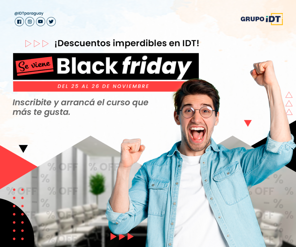 En IDT nos sumamos a la semana de descuentos con el Black Friday. Del 25 al 26 de Noviembre elegí el curso que más te guste y aprovechá nuestra MEGA PROMO.