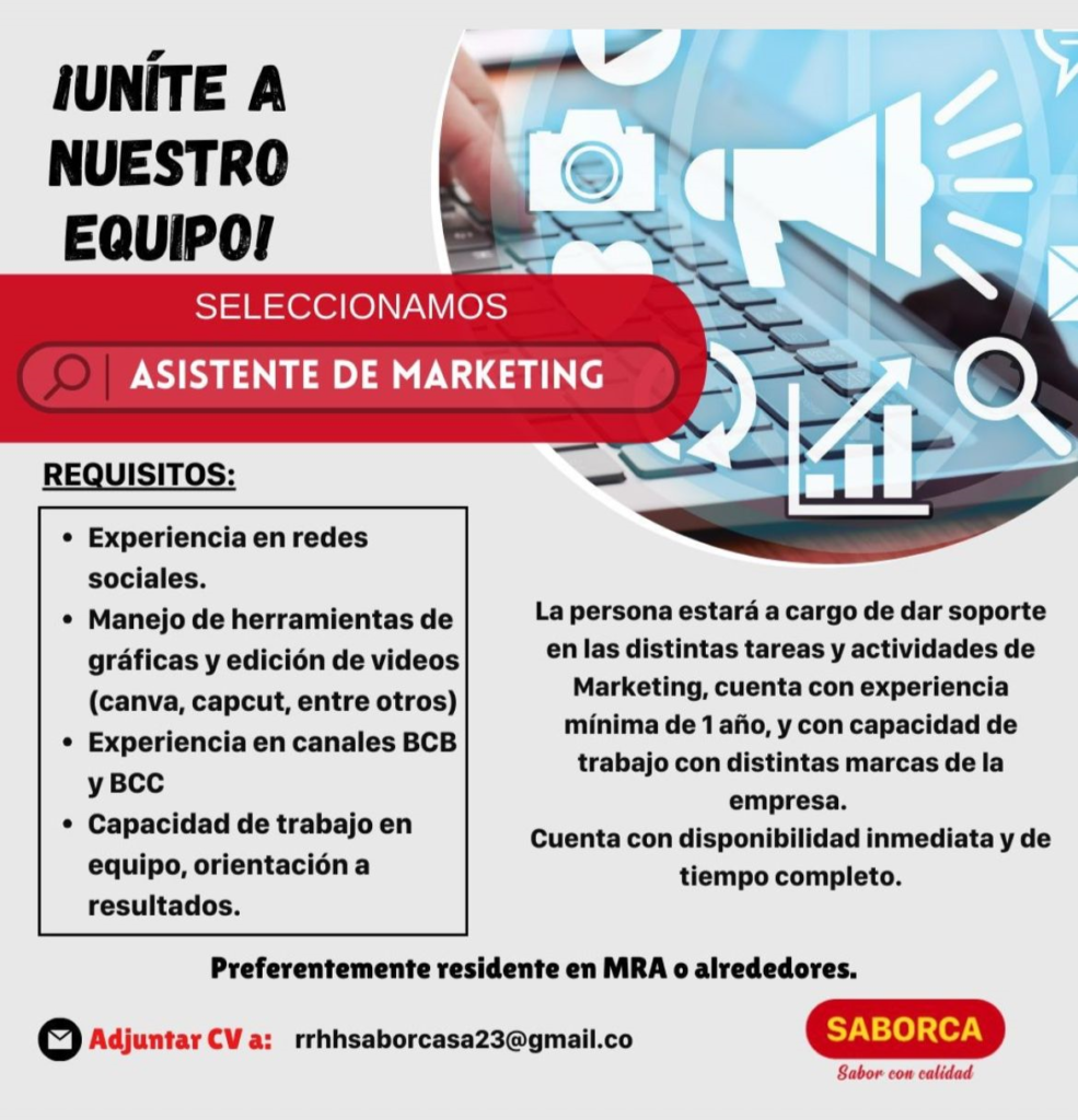 Empresa en busca de un Asistente de Marketing que cuente con el siguiente perfil: