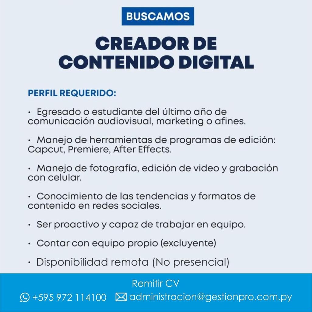 Estamos buscando un Creador/a de Contenido Digital proactivo/a y creativo/a para unirse a nuestro equipo de forma remota. La persona ideal será responsable de la producción y edición de videos y fotografías, y deberá contar con su propio equipo de trabajo para el desarrollo de las tareas.
