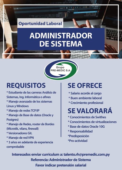 Se pone a disposición de los interesados el siguiente correo electrónico para la recepción de los CV: talento.rh@premedic.com.py Ref: Administrador de Sistema. Favor de indicar pretensión salarial en la misma.