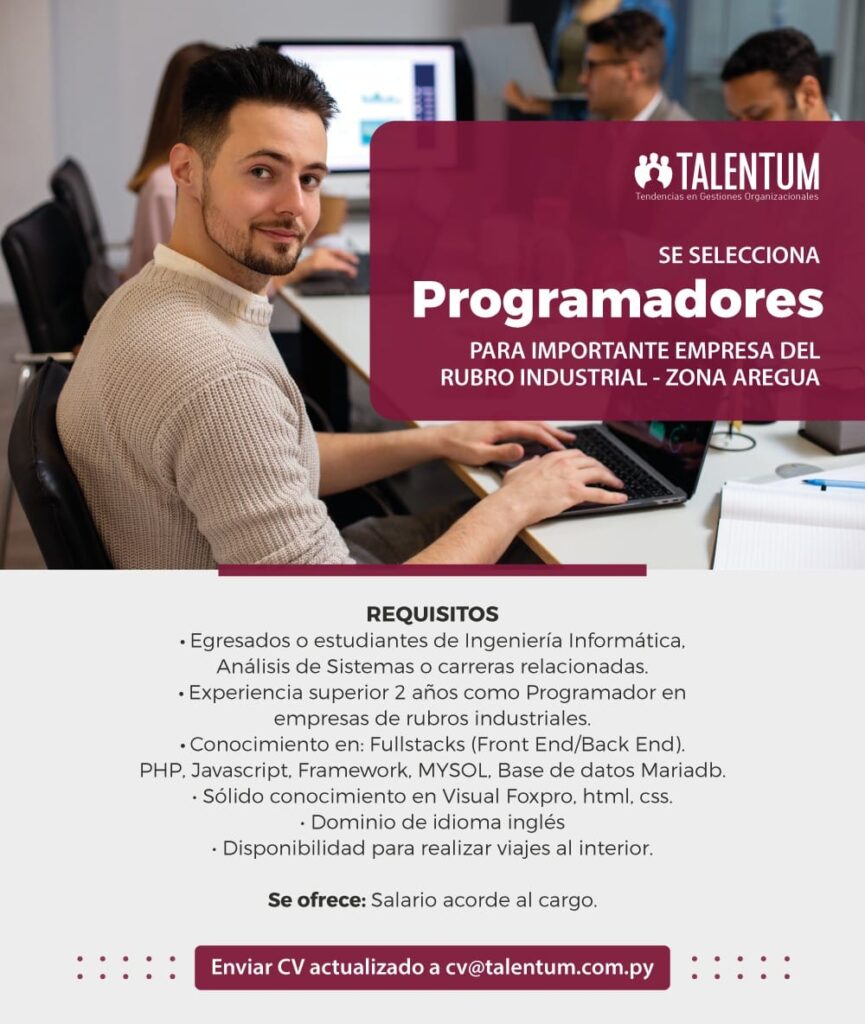 *Contar con experiencia mínima de 2 años como Programador en empresas de rubros industriales.