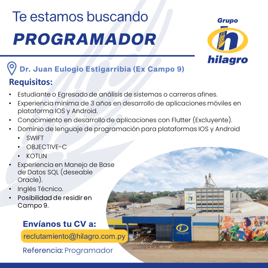 En IDT llega una nueva oferta laboral que compartimos con nuestros alumnos y ex-alumnos.  Importante empresa zona Dr. Juan Eulogio Estigarribia (Ex Campo 9) se encuentra en la búsqueda de programador con  experiencia que cumplan con los siguientes requisitos:
