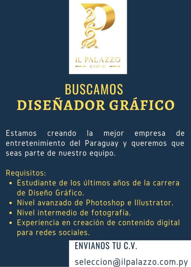 Si estás interesado/a, postulate enviando tu CV + portafolio de trabajos a seleccion@ilpalazzo.com.py con el asunto “Ref. Diseñador/a Gráfico/a”.