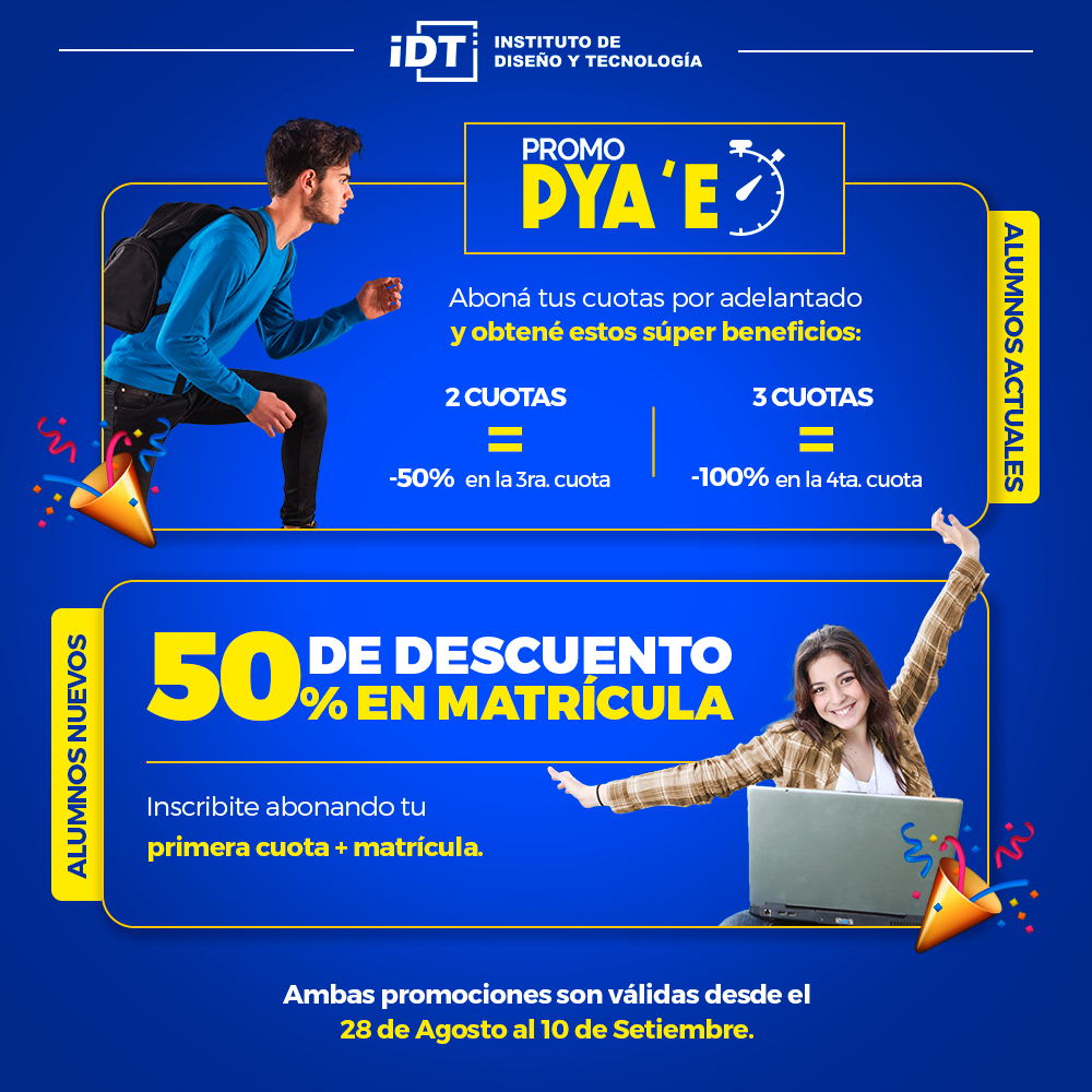 ¡Se viene nuestro Mes Aniversario y queremos celebrarlo de la mejor manera! Se cumplirán 19 de años desde que empezamos con el objetivo de capacitar profesionalmente a pequeños, jóvenes y adultos en las nuevas tecnologías. Hoy en día seguimos innovando para ofrecerte lo mejor en materia educativa, pero también tenemos más para ofrecerte: ¿Sos nuevo alumno? ¿Ya sos parte del IDT? No te preocupes, ¡nuestro cumpleaños lo celebramos con todos! Están disponibles dos nuevas súper promociones para que puedas seguir capacitándote con los mejores.