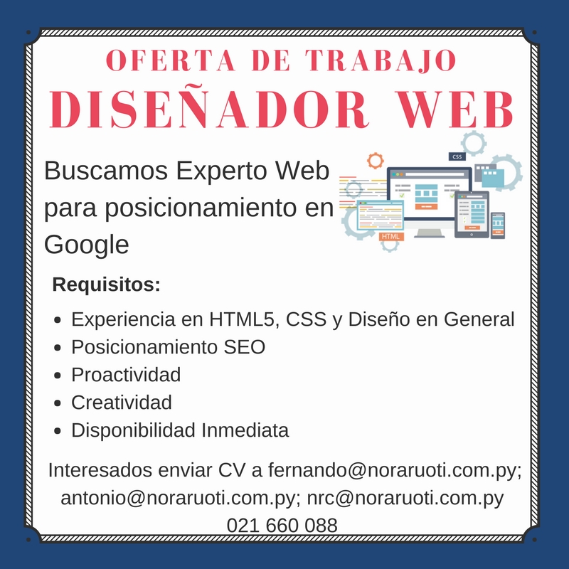 Contamos con una nueva oferta laboral que nos hicieron llegar para nuestros alumnos y exalumnos del área de Diseño Web. La oferta se enfoca a personas que tengan amplios conocimientos de HTML5, CSS y Posicionamiento SEO.