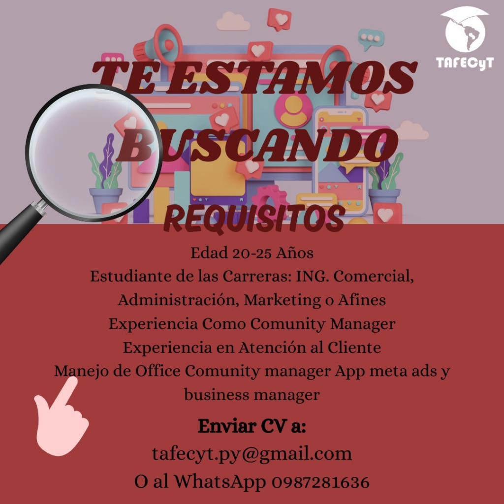 Envía tu CV a: tafecyt.py@gmail.com o al WhatsApp 0987281636.