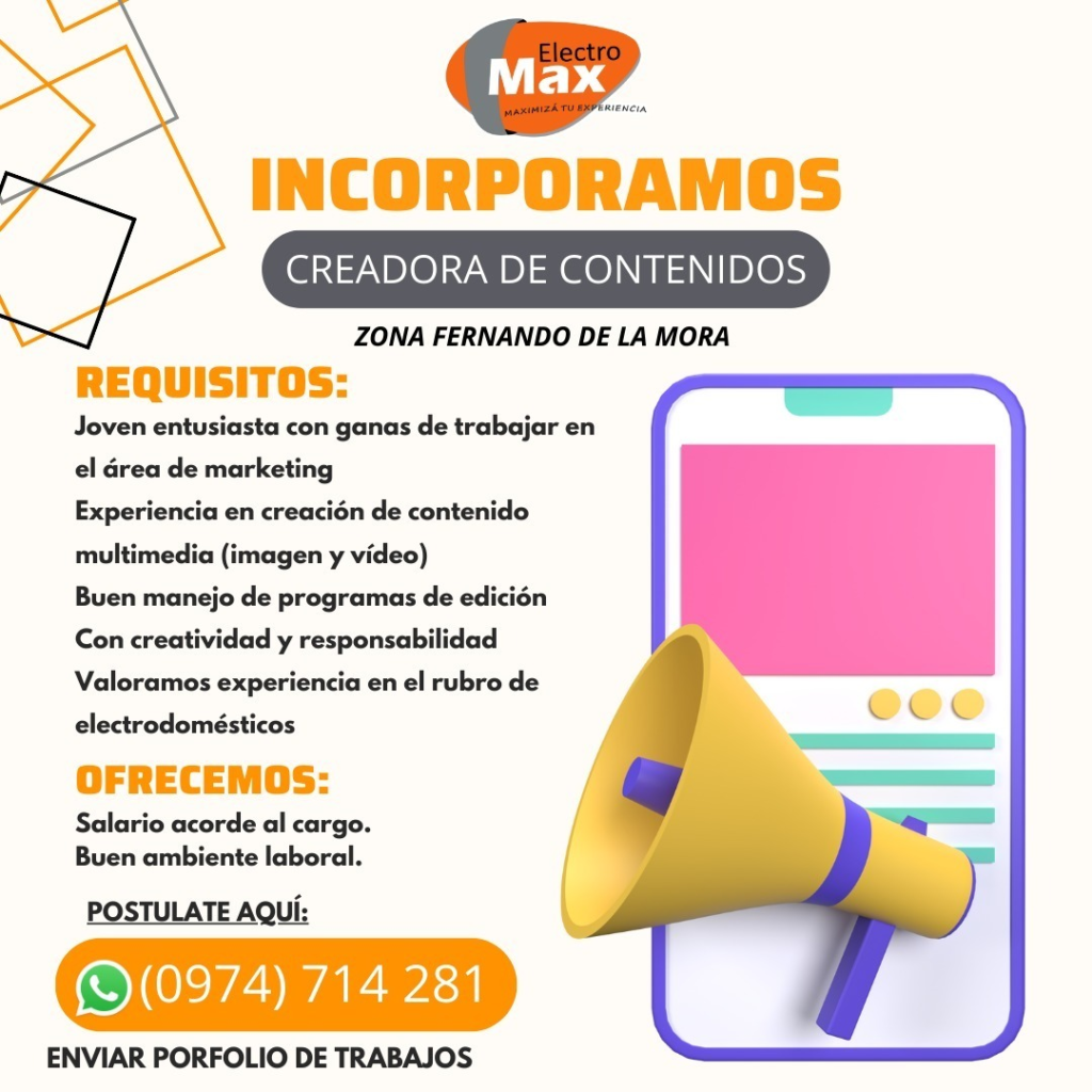 Empresa se encuentra en la búsqueda de una Creadora de Contenidos, debe cumplir con el siguiente perfil: